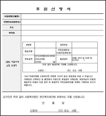 직접 은행에 방문하셔서 자동이체신청서를 작성하시면 원하시는 날짜에 인출 후원하게 됩니다.